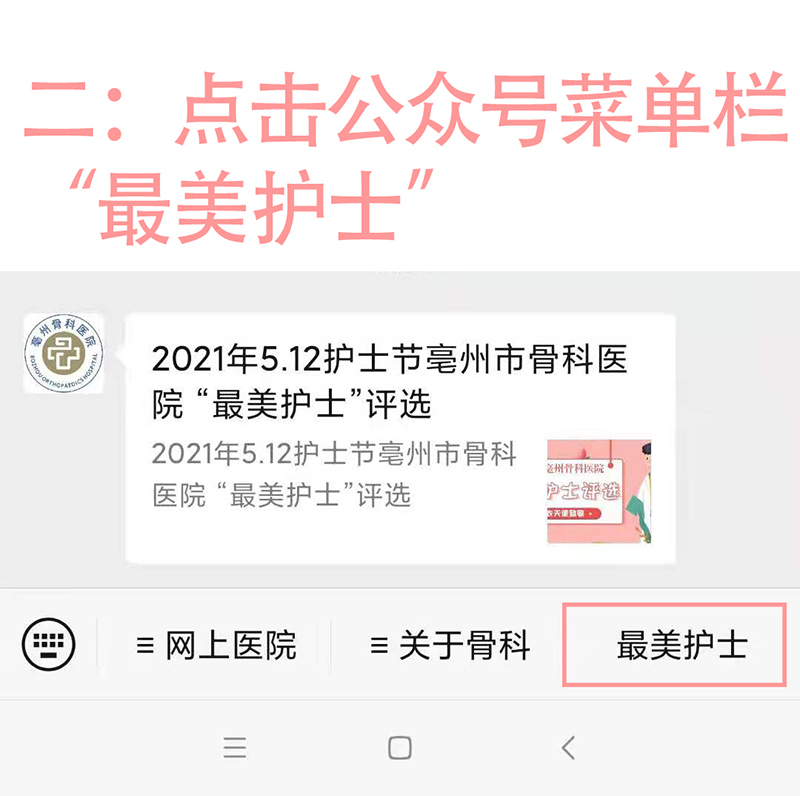 1、關(guān)注”亳州市骨科醫(yī)院”公眾號,點擊菜單欄"最美護士"進入報名頁面,報名結(jié)束后可進行投票。
