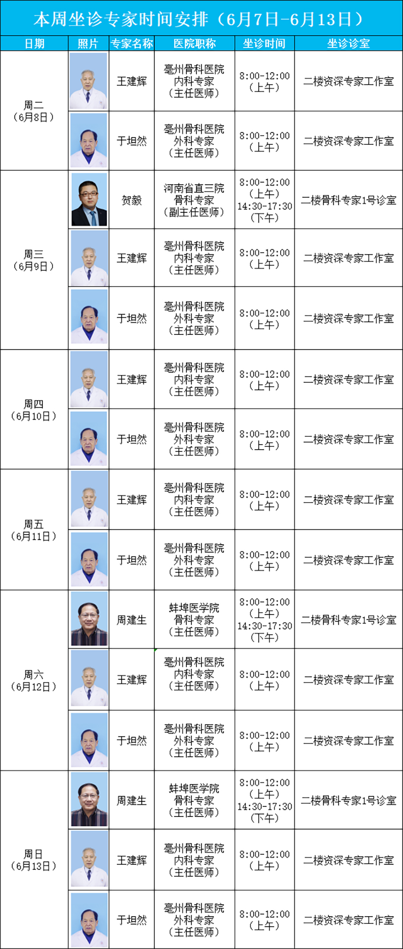 每周六、周日,亳州骨科醫(yī)院特聘省內(nèi)(蚌埠醫(yī)學院)知名專家:周建生教授、肖玉周教授、官建中教授、吳敏教授親臨我院長期坐診、查房、預(yù)約手術(shù)等。