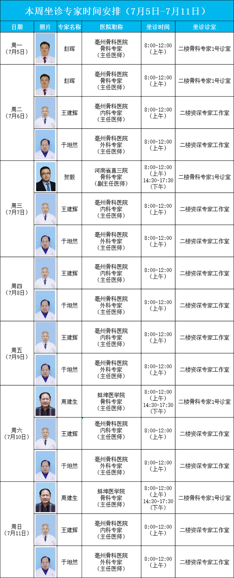 每周六、周日,亳州骨科醫(yī)院特聘省內(nèi)(蚌埠醫(yī)學(xué)院)知名專家:周建生教授、肖玉周教授、官建中教授、吳敏教授親臨我院長期坐診、查房、預(yù)約手術(shù)等。