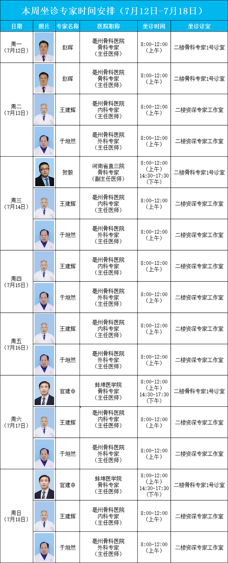 每周六、周日,亳州骨科醫(yī)院特聘省內(nèi)(蚌埠醫(yī)學(xué)院)知名專家:周建生教授、肖玉周教授、官建中教授、吳敏教授親臨我院長期坐診、查房、預(yù)約手術(shù)等。