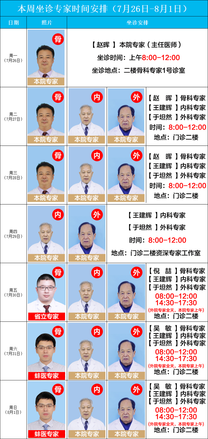 每周六、周日,亳州骨科醫(yī)院特聘省內(nèi)(蚌埠醫(yī)學院)知名專家:周建生教授、肖玉周教授、官建中教授、吳敏教授親臨我院長期坐診、查房、預約手術等。