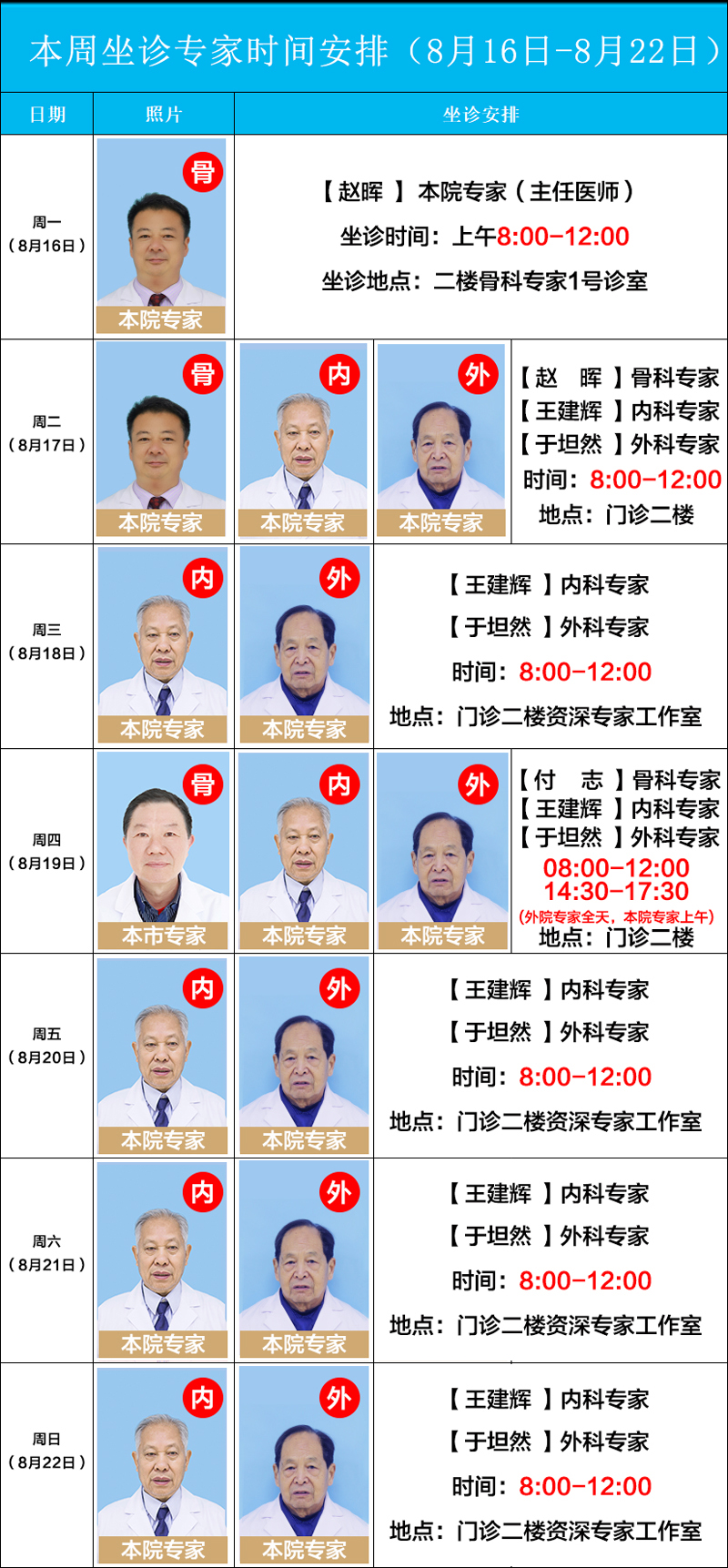 每周二至周日上午(8:00-12:00)亳州骨科醫(yī)院內(nèi)科專家王建輝,外科專家于坦然在門診樓二樓“資深專家工作室”坐診。