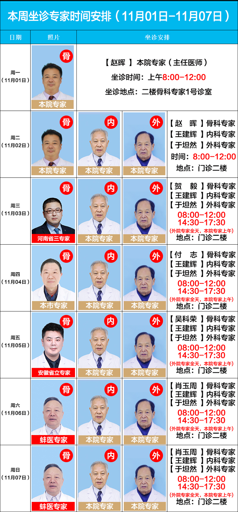 每周六、周日,亳州骨科醫(yī)院特聘省內(nèi)(蚌埠醫(yī)學(xué)院)知名專家:周建生教授、肖玉周教授、官建中教授、吳敏教授親臨我院長期坐診、查房、預(yù)約手術(shù)等。