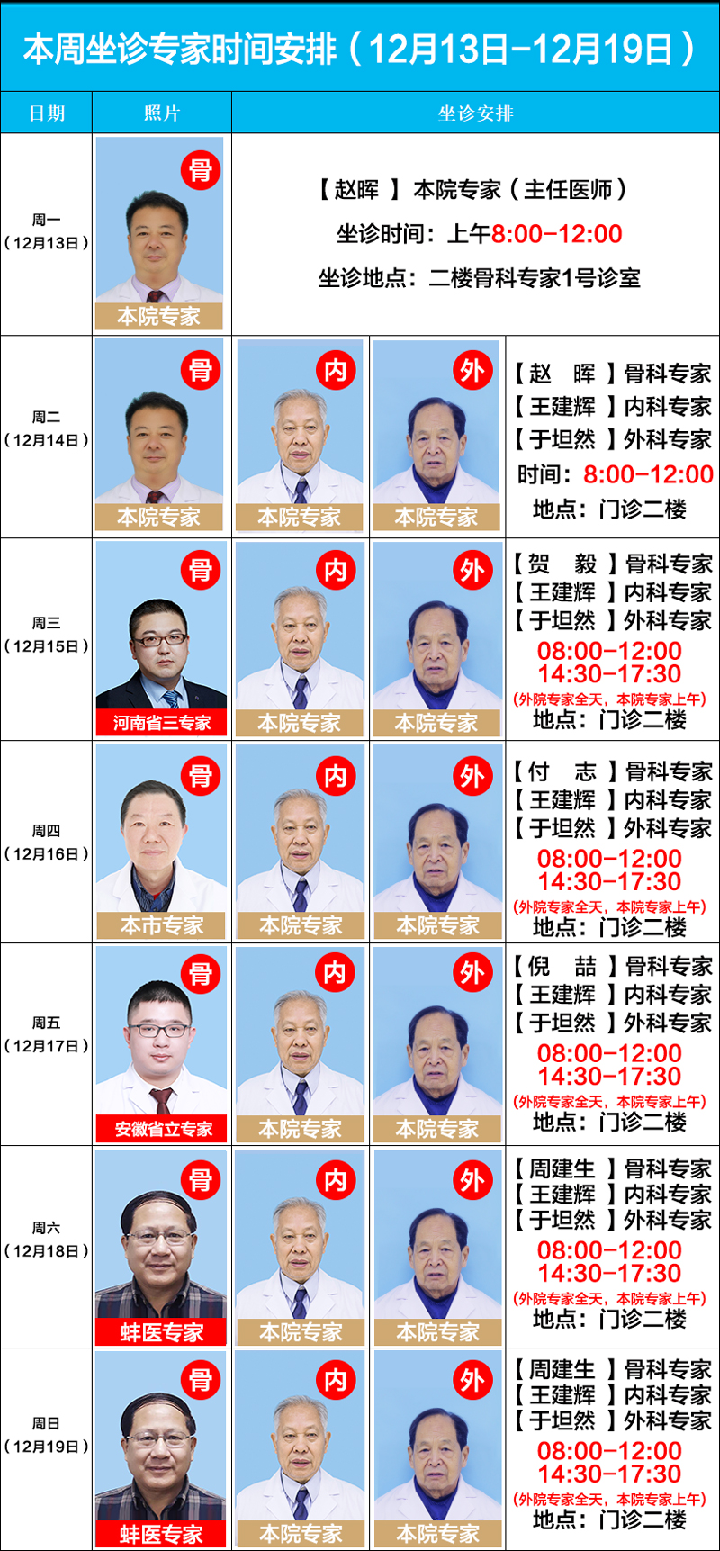每周六、周日,亳州骨科醫(yī)院特聘省內(nèi)(蚌埠醫(yī)學(xué)院)知名專家:周建生教授、肖玉周教授、官建中教授、吳敏教授親臨我院長(zhǎng)期坐診、查房、預(yù)約手術(shù)等。