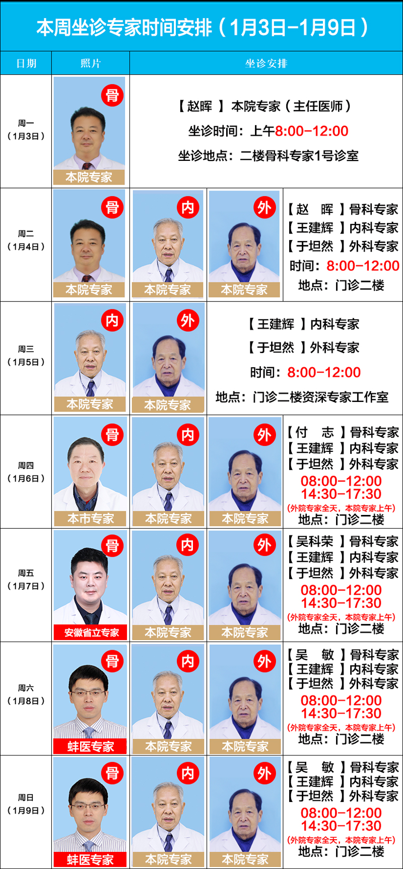 每周二至周日上午(8:00-12:00)亳州骨科醫(yī)院內(nèi)科專(zhuān)家王建輝,外科專(zhuān)家于坦然在門(mén)診樓二樓“資深專(zhuān)家工作室”坐診。