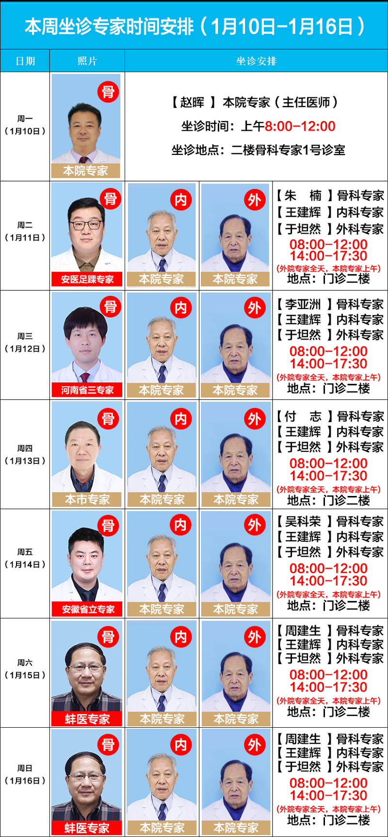 每周六、周日,亳州骨科醫(yī)院特聘省內(nèi)(蚌埠醫(yī)學(xué)院)知名專家:周建生教授、肖玉周教授、官建中教授、吳敏教授親臨我院長(zhǎng)期坐診、查房、預(yù)約手術(shù)等。