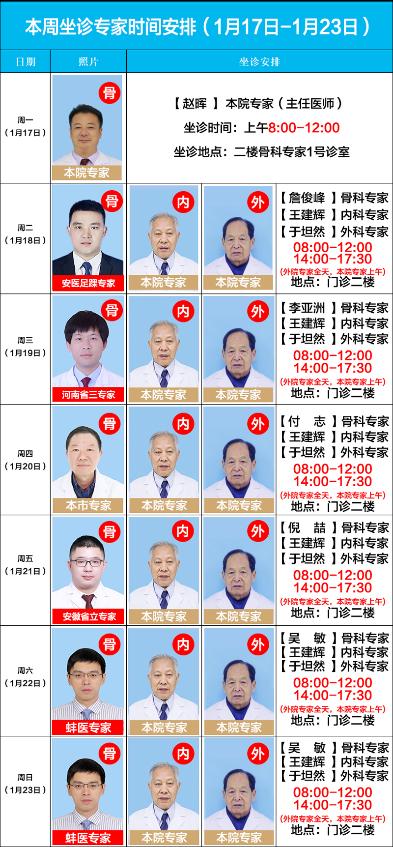 每周二至周日上午(8:00-12:00)亳州骨科醫(yī)院內科專家王建輝,外科專家于坦然在門診樓二樓“資深專家工作室”坐診。