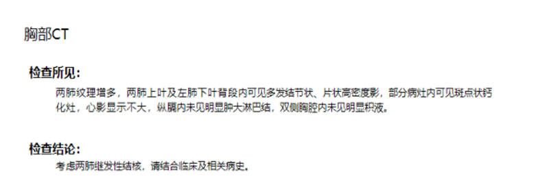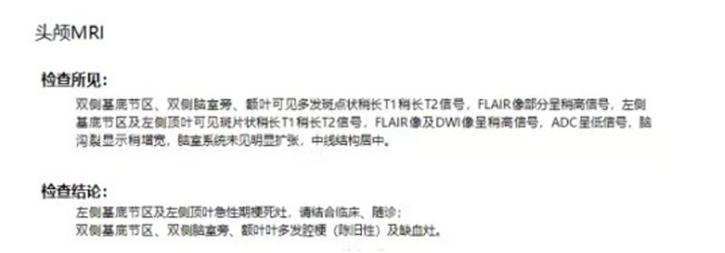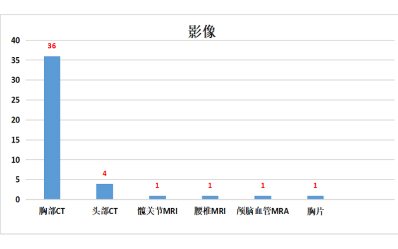 一、其中影像學(xué)檢查重要異常結(jié)果:胸部CT36例、頭顱MRI 12例、頭顱CT 4例、髖關(guān)節(jié)MRI 1例、胸片1例、腰椎MRI 1例、顱腦血管MRA1例共計(jì)56例。