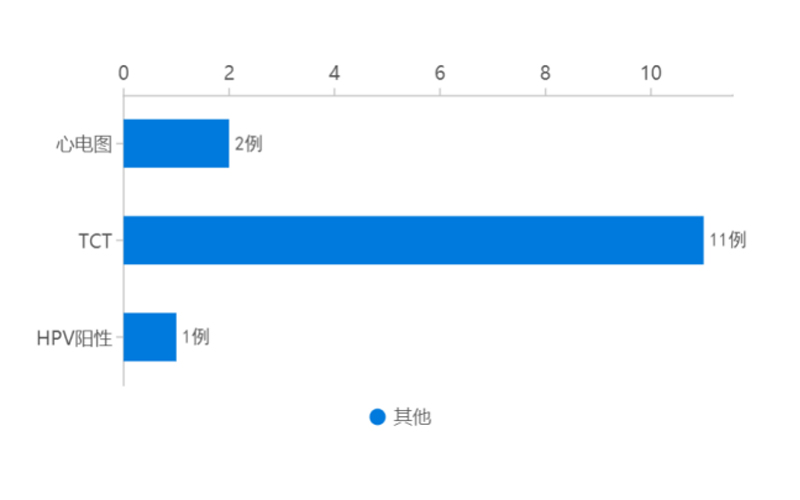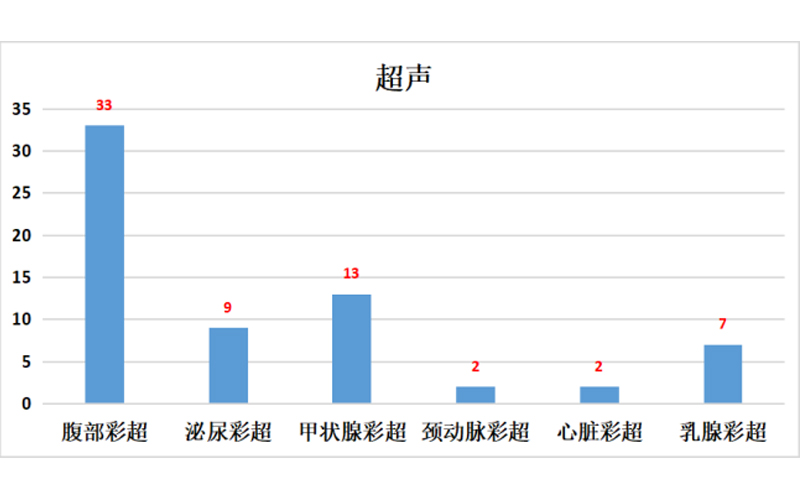 二、超聲類重要異常:腹部彩超33例、泌尿彩超9例、甲狀腺彩超13例、頸動(dòng)脈彩超2例、心臟彩超2例、乳腺彩超7例共計(jì)66例。