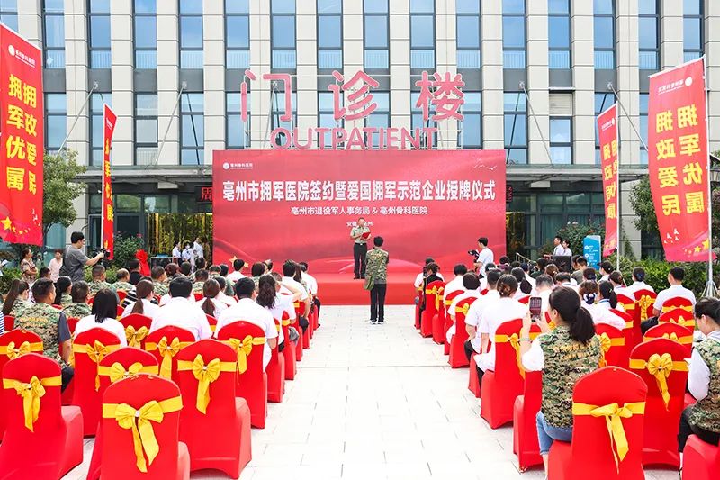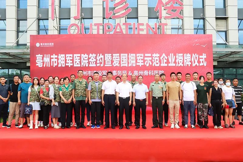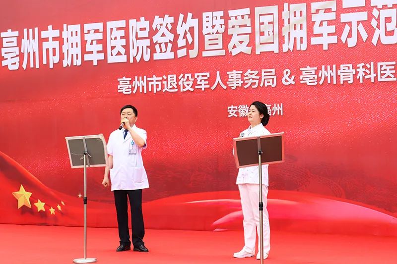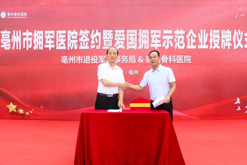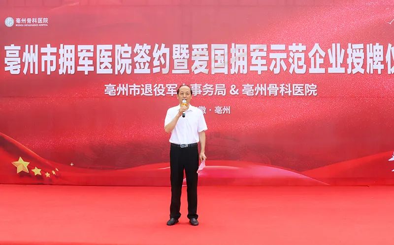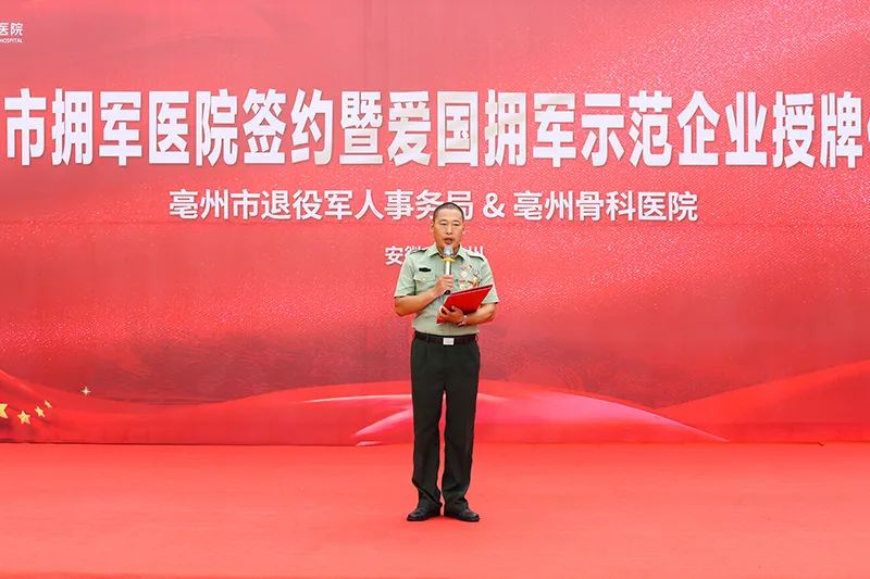 為進(jìn)一步弘揚(yáng)“擁政愛民、擁軍優(yōu)屬”優(yōu)良傳統(tǒng),持續(xù)推進(jìn)雙擁共建社會化的工作目標(biāo),不斷鞏固和發(fā)展軍政軍民團(tuán)結(jié),營造軍愛民,民擁軍的濃厚氛圍,培育在全社會形成“讓軍人成為全社會尊崇的職業(yè)”的鮮明社會價值導(dǎo)向,2023年8月1日,“亳州市擁軍醫(yī)院簽約暨愛國擁軍示范企業(yè)授牌儀式”在亳州骨科醫(yī)院盛大舉行,亳州市退役軍人事務(wù)局副局長趙傳璽、譙城區(qū)退役軍人事務(wù)局副局長李厚福、高新區(qū)社會事務(wù)局工作人員陳寧、亳州市擁軍協(xié)會會長李祥林、亳州骨科醫(yī)院董事長常永光以及邊海防官兵家庭和退役軍人代表出席簽約儀式。