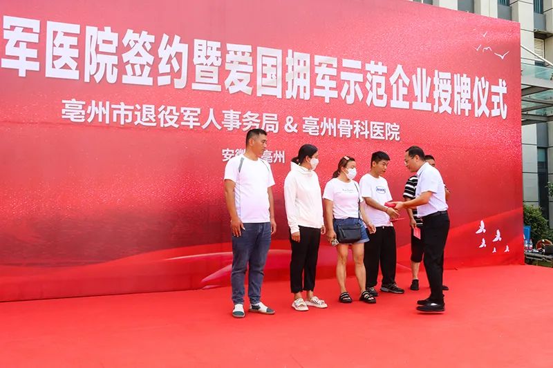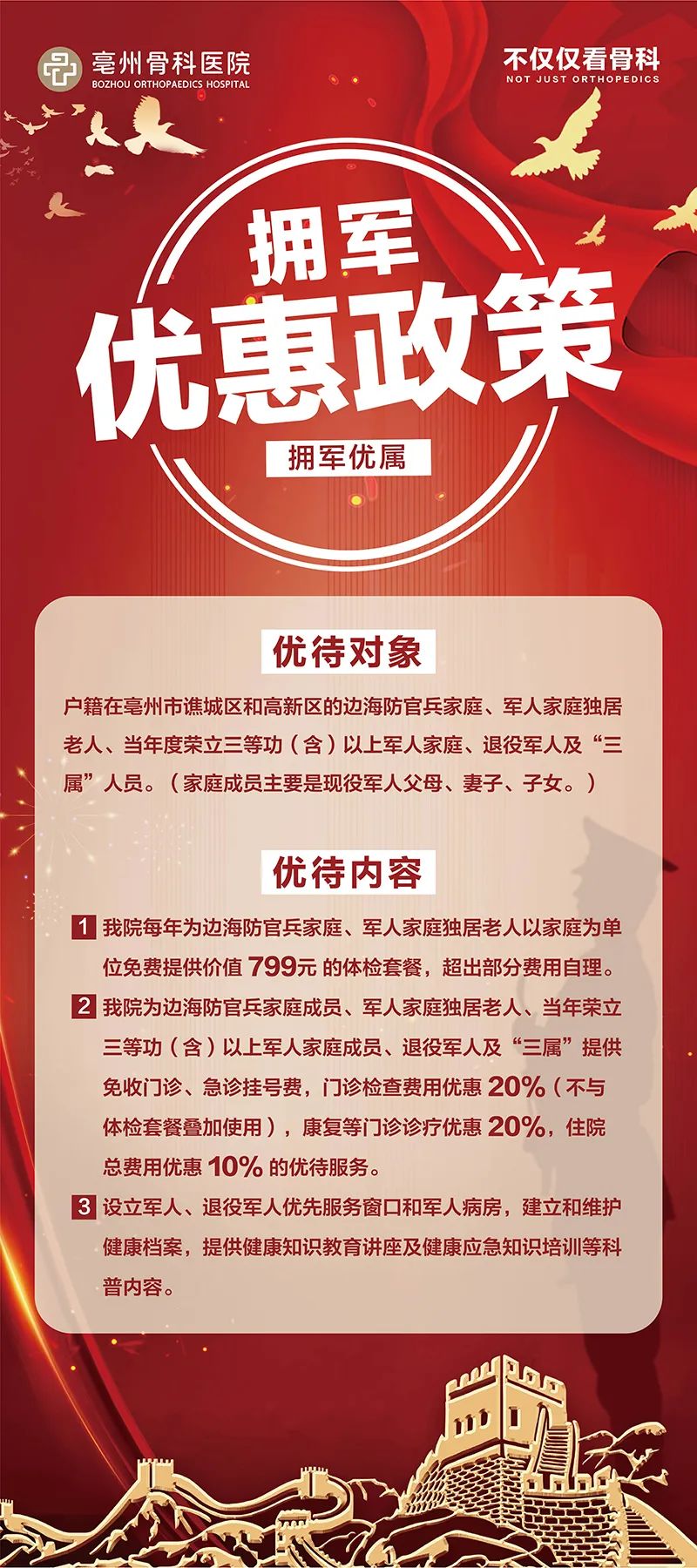 本次擁軍醫(yī)院簽約,是遵循國家和社會相結(jié)合的工作方針,秉持體現(xiàn)尊崇、激勵的政策導(dǎo)向,推進(jìn)社會化擁軍優(yōu)撫工作的重要方式,也是落實優(yōu)待政策、惠及退役軍人的實際舉措。亳州骨科醫(yī)院推出擁軍特惠政策,每年為邊海防官兵家庭、軍人家庭獨(dú)居老人以家庭為單位免費(fèi)提供體驗套餐,并為邊海防官兵家庭、軍人家庭獨(dú)居老人、以及當(dāng)年榮立三等功(含)以上軍人家庭成員、退役軍人及“三屬”提供免收門診、急診掛號費(fèi),給予門診檢查、康復(fù)等門診診療、住院總費(fèi)用優(yōu)惠等優(yōu)待服務(wù)。同時,醫(yī)院還設(shè)立軍人、退役軍人優(yōu)先服務(wù)窗口和軍人病房,建立和維護(hù)健康檔案,提供健康知識教育講座及健康應(yīng)急知識培訓(xùn)等科普內(nèi)容。