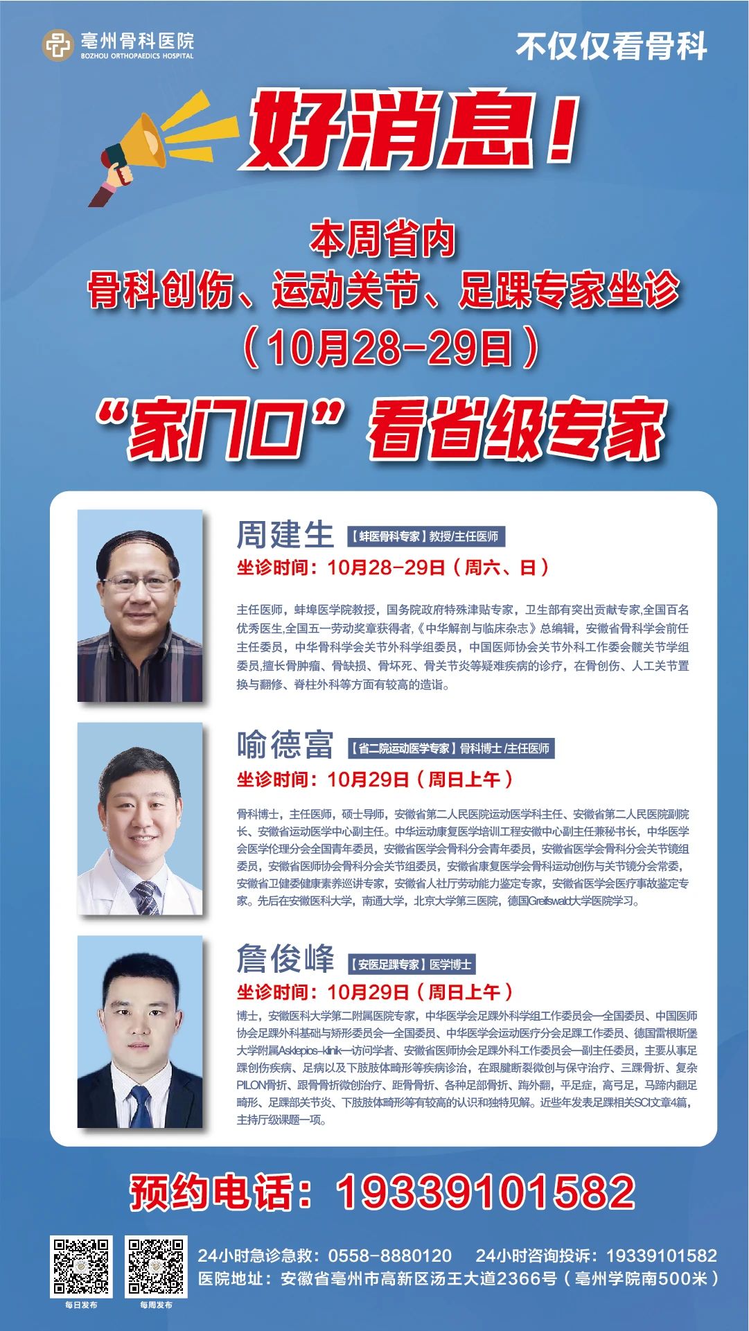 24小時(shí)急診急救電話:0558-8880120 24小時(shí)咨詢投訴:19339101582 普惠體檢中心:0558-5520830