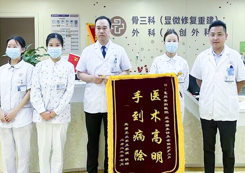 王書強(qiáng)主任對(duì)自己要求很嚴(yán)格,對(duì)病人極度負(fù)責(zé),每次手術(shù)前,他都會(huì)詳細(xì)、周密的制定手術(shù)方案,不放過手術(shù)的每一個(gè)細(xì)節(jié)。手術(shù)中他會(huì)聚精會(huì)神、小心翼翼,力求把手術(shù)做到最好。而手術(shù)后他更會(huì)密切監(jiān)測(cè)、注意病情的變化,防止每一個(gè)可能的并發(fā)癥,并親自去指導(dǎo)幫助患者進(jìn)行手術(shù)后康復(fù)鍛煉,盡可能讓患者得到最好的治療和康復(fù),認(rèn)真的態(tài)度,熟練的技能得到患者的信任和認(rèn)可,出院患者送來錦旗表示感謝“醫(yī)術(shù)高明,手到病除”。