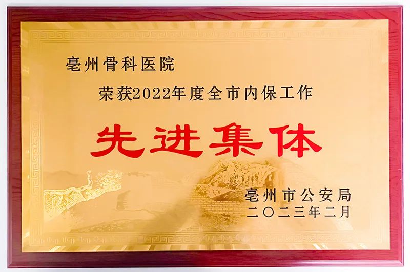 2023年2月,亳州骨科醫(yī)院喜獲由亳州市公安局頒發(fā)的“全市內(nèi)保工作先進(jìn)集體”榮譽(yù)稱號(hào)。