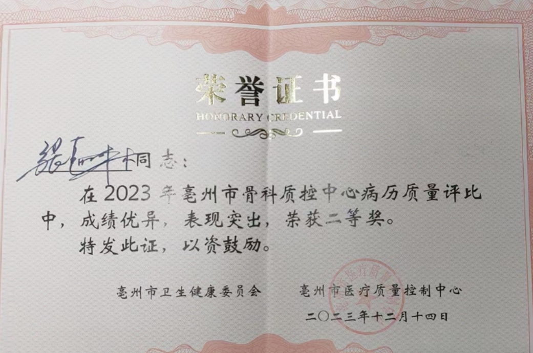 2023年12月14日,亳州骨科醫(yī)院脊柱、足踝外科團(tuán)隊(duì)在“亳州市骨科質(zhì)控中心病歷質(zhì)量評(píng)比中榮獲二等獎(jiǎng)”!