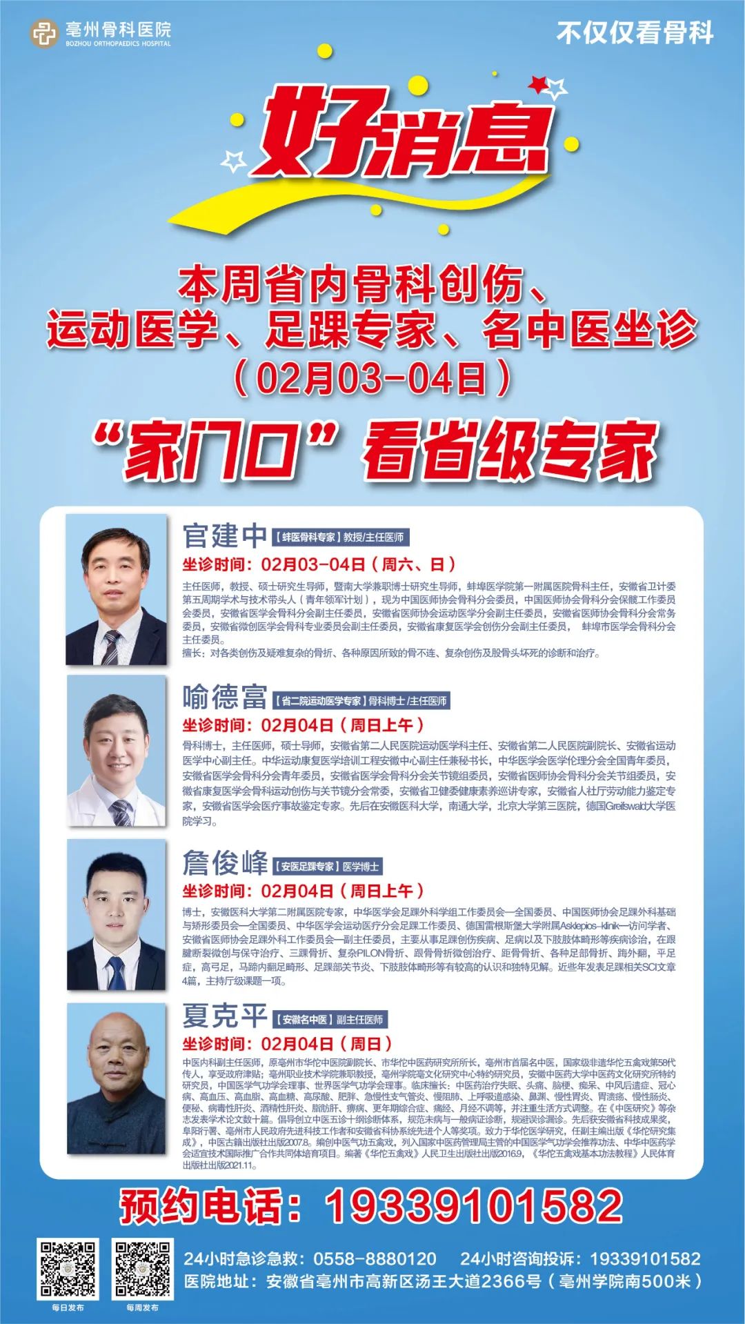 好消息!本周省內(nèi)骨科創(chuàng)傷、運動醫(yī)學(xué)、足踝專家、名中醫(yī)坐診(2024年2月3-4日)