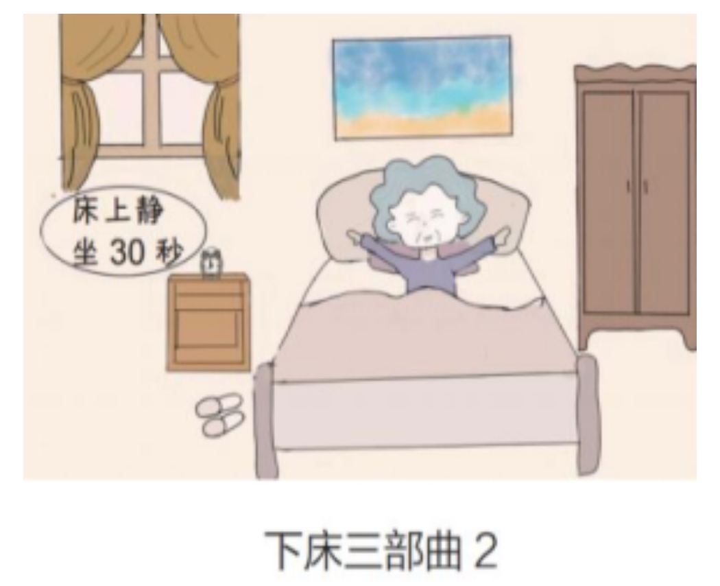 4.高危險人群學(xué)會起床三部曲。睡醒后先平躺30秒;床上靜坐30秒;床邊再坐30秒后緩慢起身。