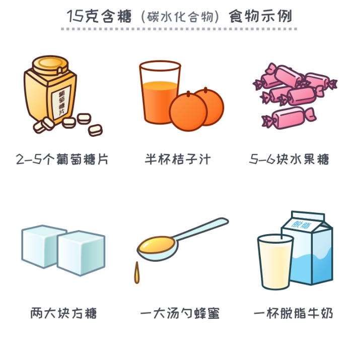 有低血糖癥狀時,需要立刻測血糖,若血糖≤3.9 mmol/L,要吃15克糖類食物,可以是2~5個葡萄糖片或半杯桔子汁或5~6塊水果糖或兩大塊方糖或一大湯勺蜂蜜或一杯脫脂牛奶(任選其一)。