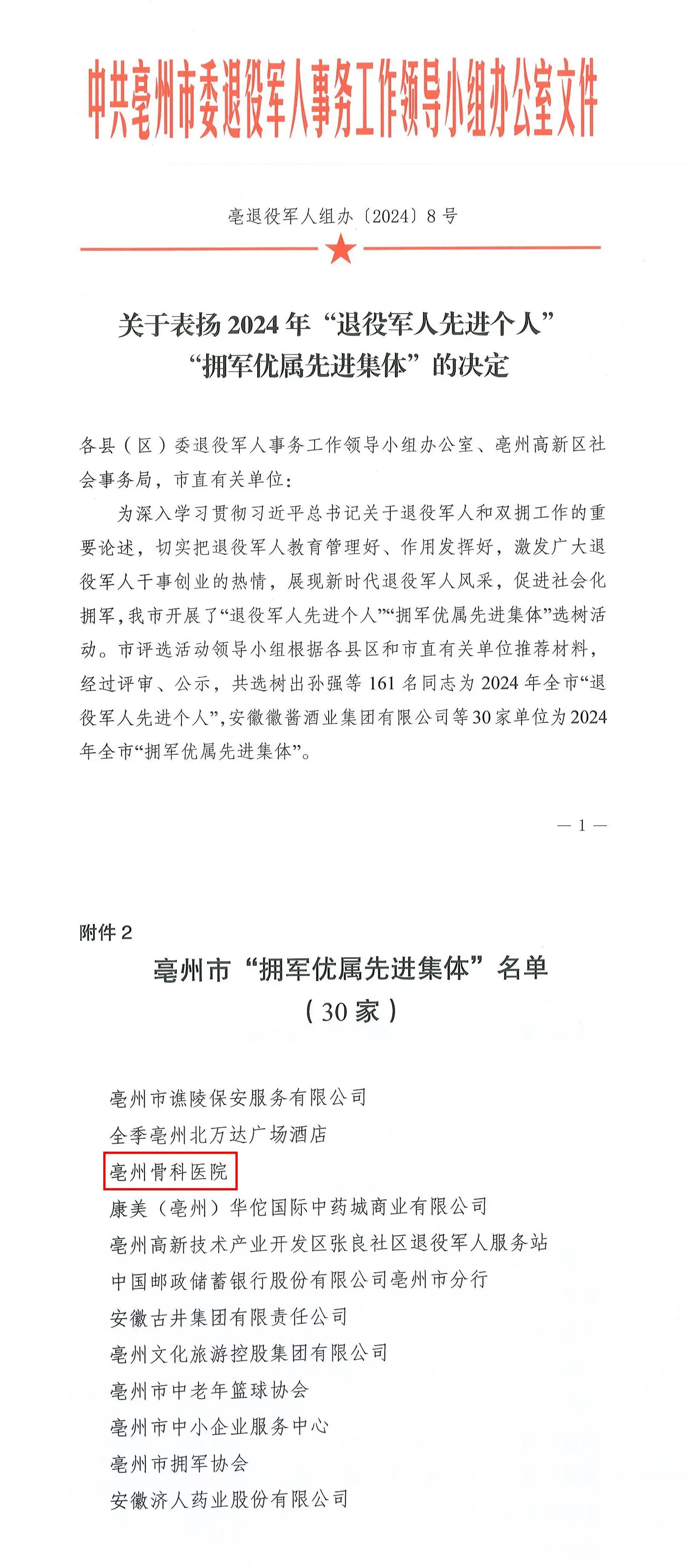 2024年11月26日,亳州骨科醫(yī)院榮獲由中共亳州市委退役軍人事務(wù)工作領(lǐng)導(dǎo)小組辦公室授予的“擁軍優(yōu)屬先進(jìn)集體”榮譽(yù)稱號。這份榮譽(yù)是對醫(yī)院長期以來積極履行社會責(zé)任,扎實(shí)開展雙擁工作的充分肯定和高度褒獎。