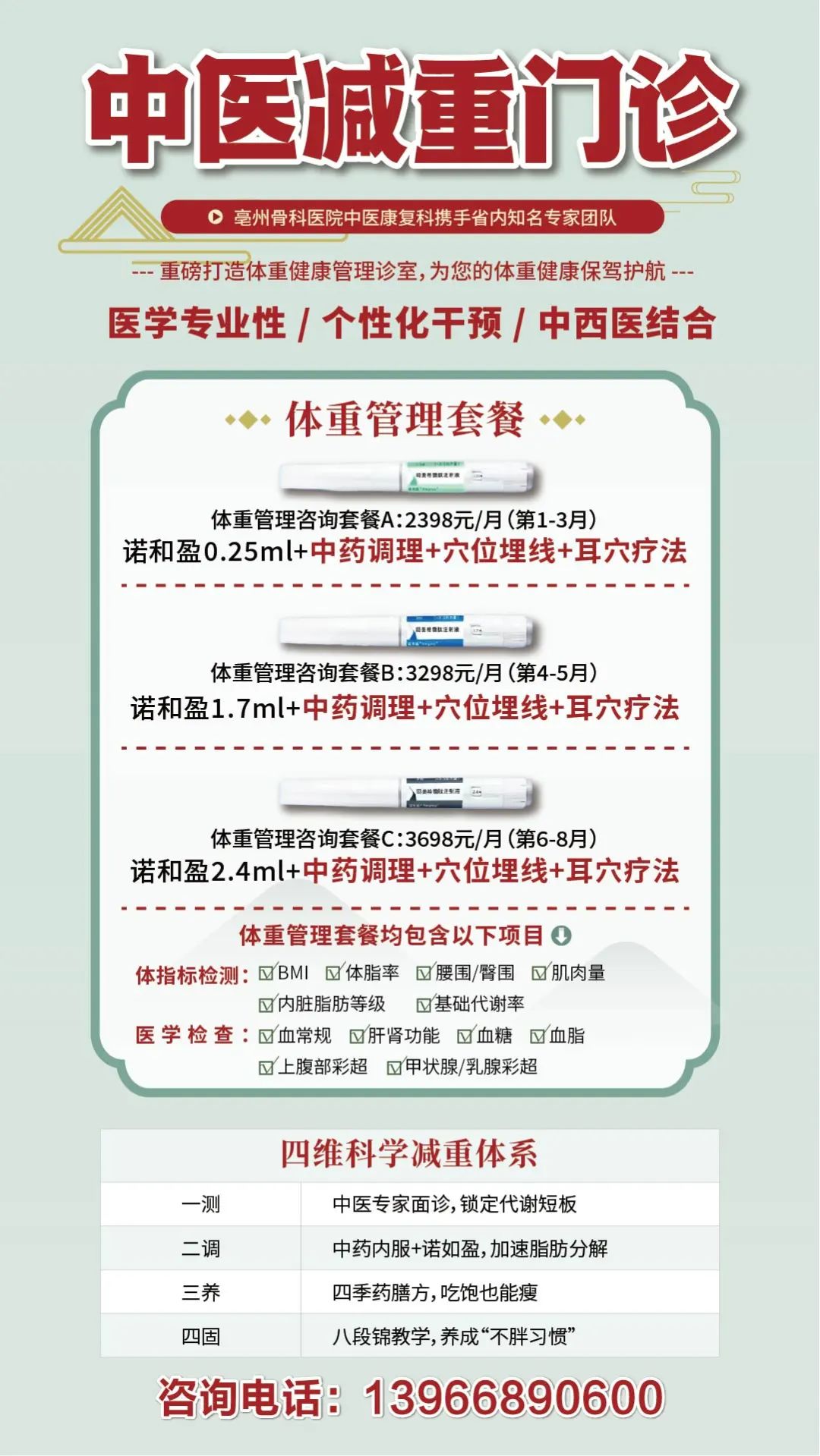 專業(yè)干預(yù):我院全新推出“諾和盈+中藥調(diào)理+穴位埋線+耳穴療法”四位一體體重管理套餐,從基礎(chǔ)健康篩查到精準(zhǔn)干預(yù),幫助您高效、安全地實(shí)現(xiàn)瘦身目標(biāo)。