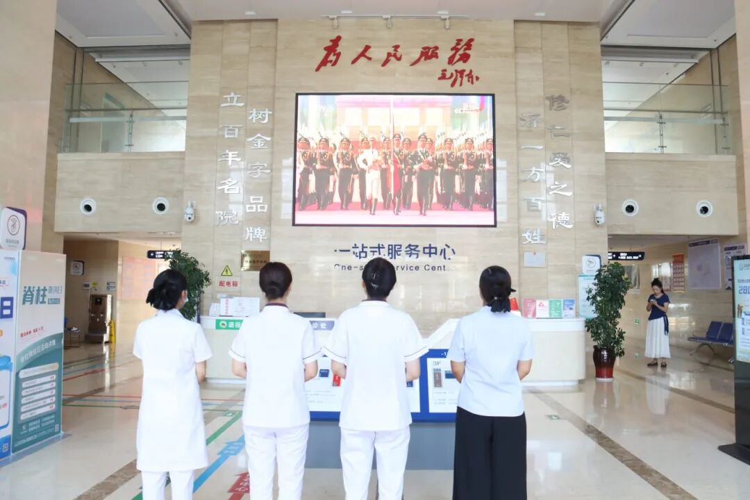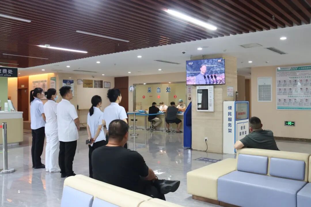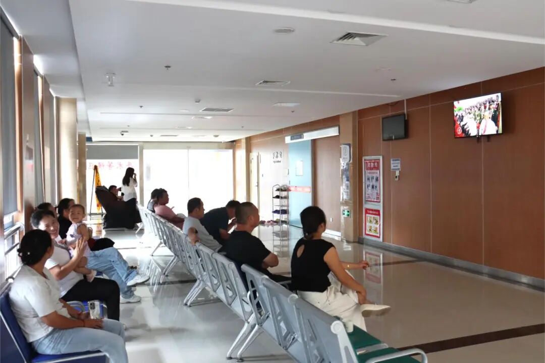 上午9時(shí),大會(huì)正式開(kāi)始。第一會(huì)議室內(nèi)黨員干部們神情專注,莊嚴(yán)肅穆。與此同時(shí),醫(yī)院各區(qū)域的大屏幕同步播放大會(huì)盛況。無(wú)論是候診的患者、陪伴的家屬,還是辛勤的醫(yī)護(hù)人員,大家都被恢宏的畫(huà)面和雄壯的國(guó)歌深深感染。