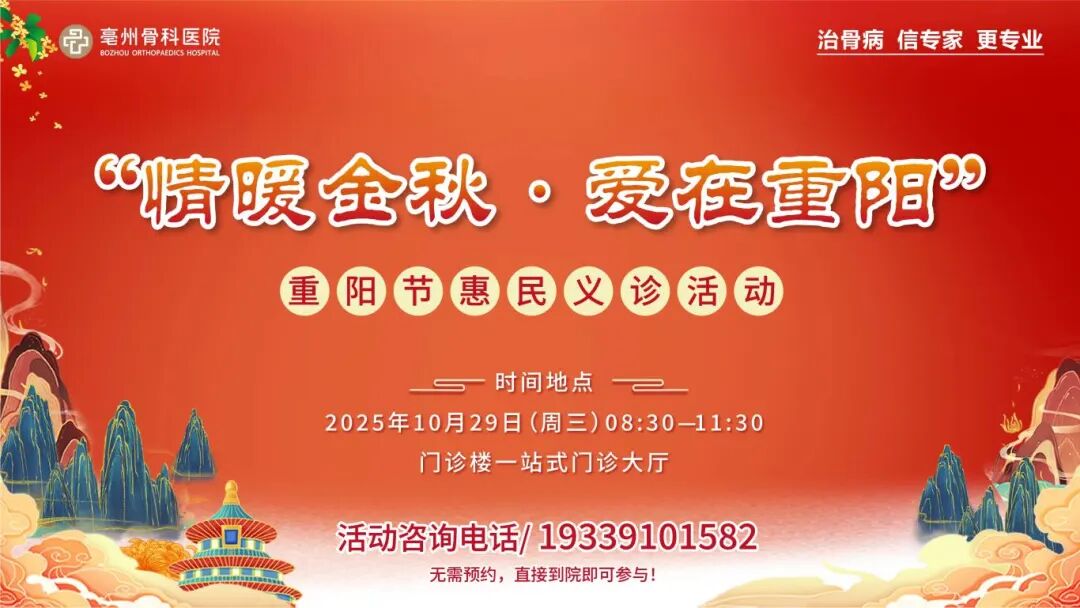 金秋十月,丹桂飄香。又是一年重陽至,歲歲皆安康。為弘揚(yáng)敬老愛老的傳統(tǒng)美德,關(guān)愛中老年朋友的健康,亳州骨科醫(yī)院將于