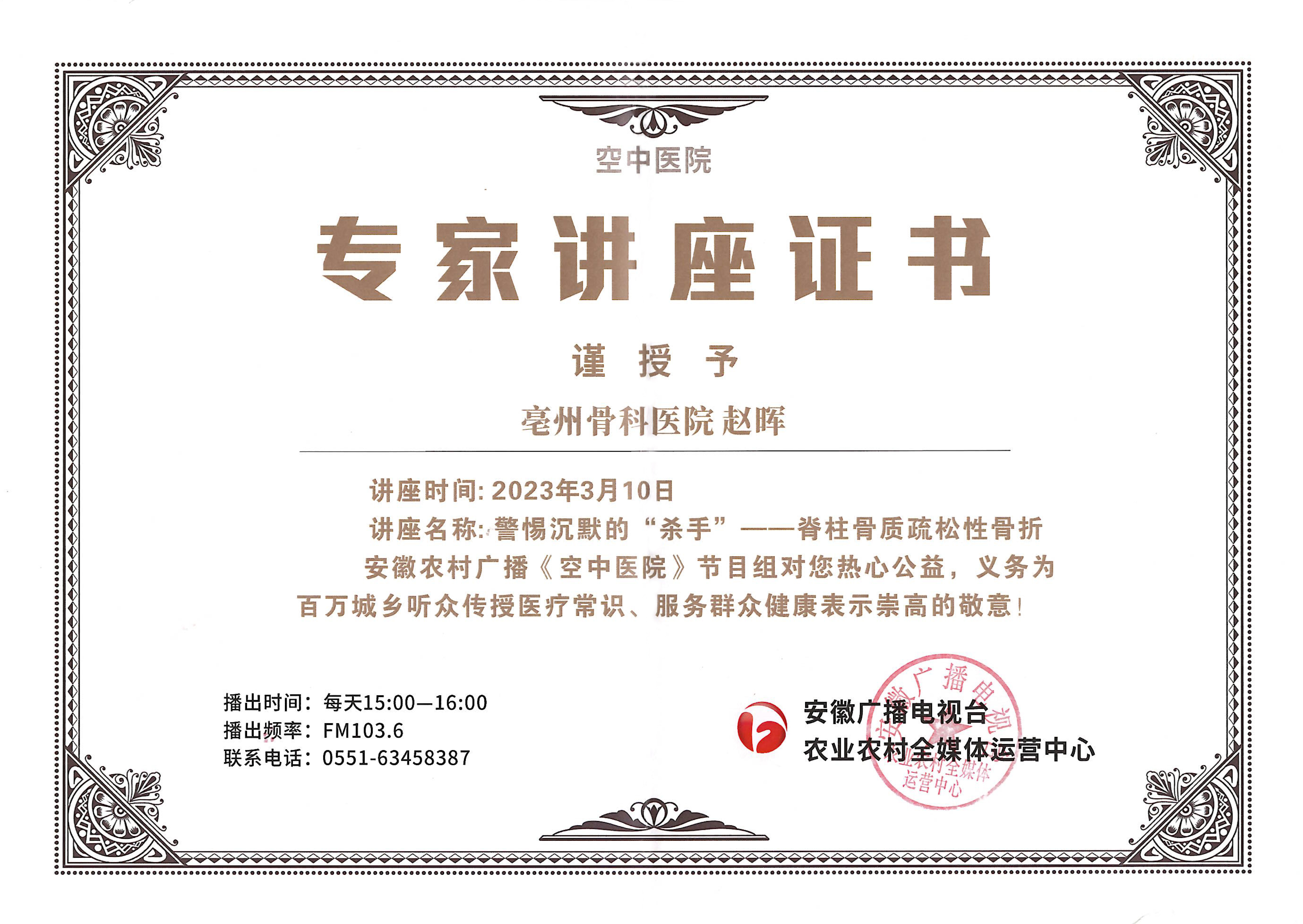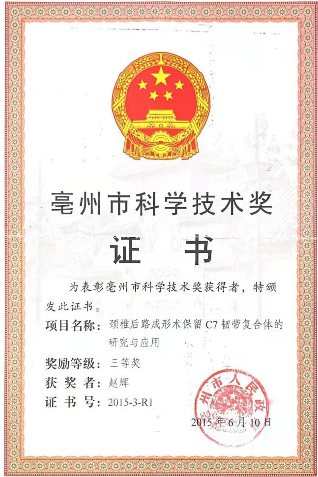 2015年6月10日趙暉醫(yī)生獲得亳州市人民政府頒發(fā)的亳州市科學(xué)技術(shù)獎(jiǎng),此為表彰亳州市科學(xué)技術(shù)獎(jiǎng)獲得者。