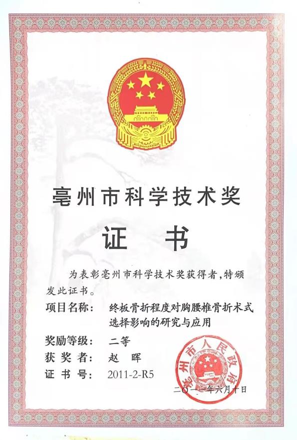 2011年6月10日趙暉醫(yī)生獲得亳州市人民政府頒發(fā)的亳州市科學(xué)技術(shù)獎(jiǎng),此為表彰亳州市科學(xué)技術(shù)獎(jiǎng)獲得者。