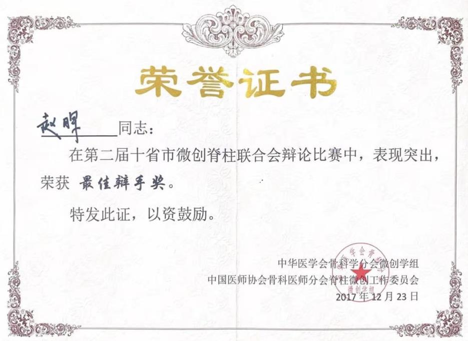 2017年12月23日趙暉同志在第二屆十省市微創(chuàng)脊柱聯(lián)合會(huì)辯論比賽中,表現(xiàn)突出,榮獲最佳辯手獎(jiǎng)。