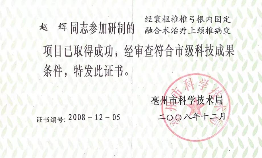 2008年12月趙輝同志參加研制的經(jīng)寰樞椎椎弓根內(nèi)固定融合術(shù)治療上頸椎病變項(xiàng)目己取得成功,經(jīng)審查符合市級(jí)科技成果條件。亳州市科學(xué)技術(shù)局