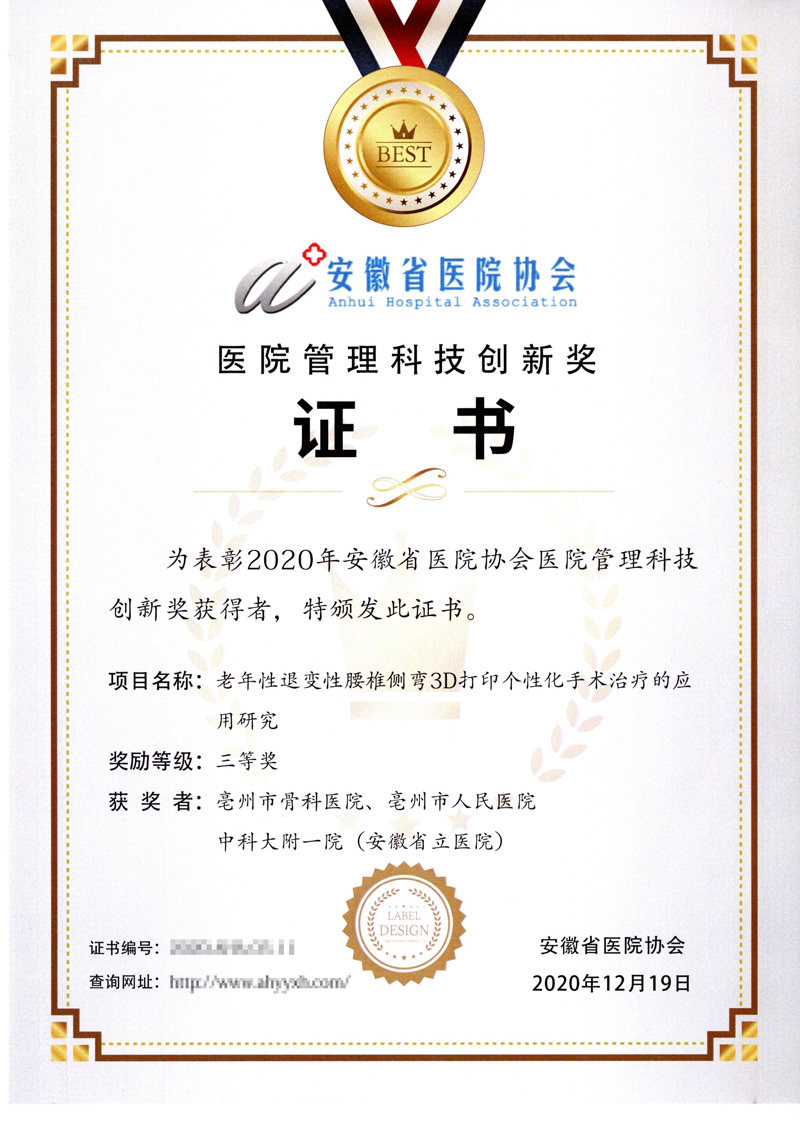 安徽省醫(yī)院協(xié)會(huì)2020年12月19日為表彰2020年安徽省醫(yī)院協(xié)會(huì)醫(yī)院管理科技創(chuàng)新獎(jiǎng)獲得者