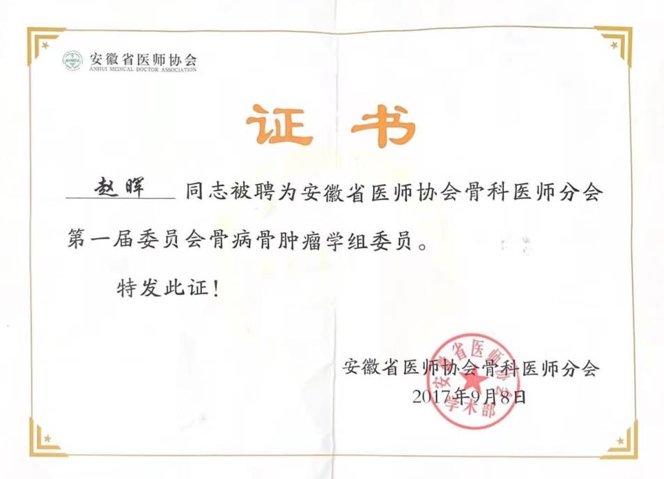 安徽省醫(yī)師協(xié)會(huì)骨科醫(yī)師分會(huì)2017年9月8日聘請(qǐng)趙暉同志為安徽省醫(yī)師協(xié)會(huì)骨科醫(yī)師分會(huì)第一屆委員會(huì)骨病骨腫瘤學(xué)組委員。