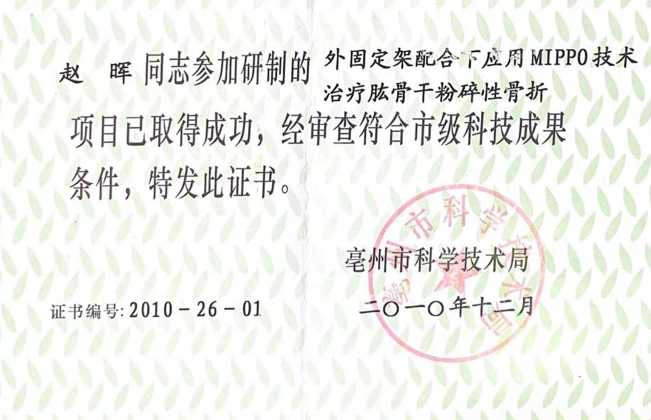 2010年12月趙暉同志參加研制的外固定架配合下應(yīng)用MIPPO技術(shù)治療肱骨千粉碎性骨折項(xiàng)目己取得成功,經(jīng)審查符合市級(jí)科技成果。亳州市科學(xué)技術(shù)局
